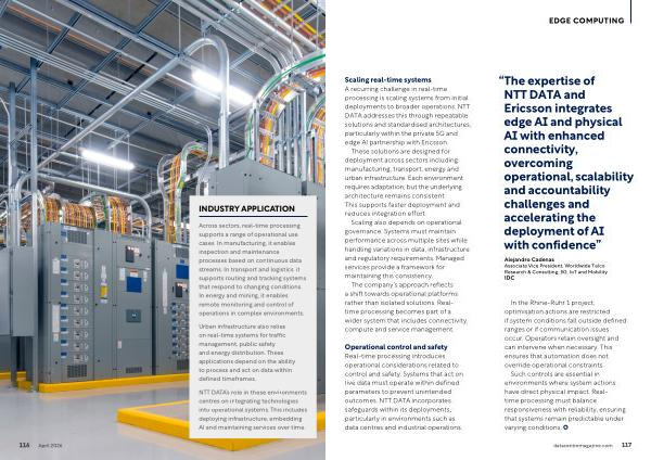 Scaling real-time systems A recurring challenge in real-time processing is scaling systems from initial deployments to broader operations. NTT DATA addresses this through repeatable solutions and standardised architectures, particularly within the private 5G and edge AI partnership with Ericsson.