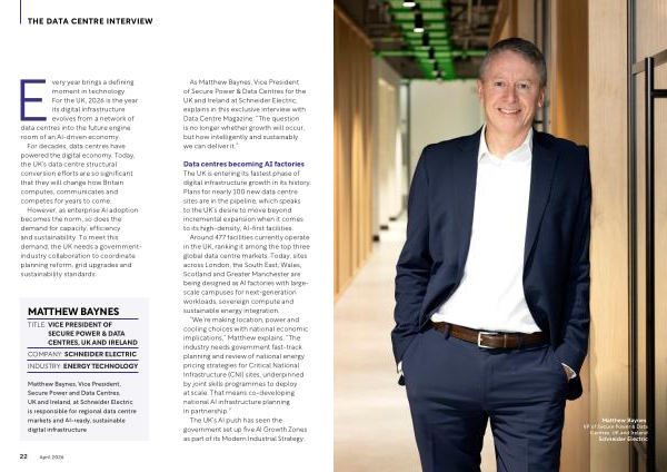 As Matthew Baynes, Vice President of Secure Power & Data Centres for the UK and Ireland at Schneider Electric, explains in this exclusive interview with Data Centre Magazine:“ The question is no longer whether growth will occur, but how intelligently and sustainably we can deliver it.”