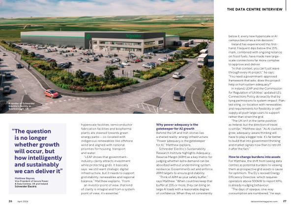 Matthew Baynes, Vice President of Secure Power & Data Centres, UK and Ireland, Schneider Electric hyperscale facilities, semiconductor fabrication facilities and biopharma plants are steered towards green energy parks – co-located with indigenous renewables like offshore wind and aligned with national priorities for housing, transport and water.