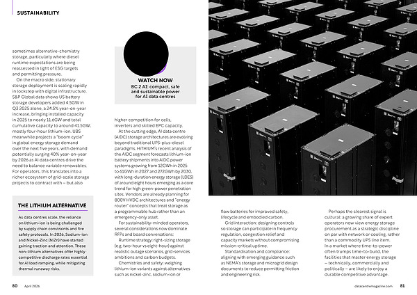 As data centres scale, the reliance on lithium-ion is being challenged by supply chain constraints and fire safety protocols. In 2026, Sodium-ion and Nickel-Zinc( NiZn) have started gaining traction and attention. These non-lithium alternatives offer highly competitive discharge rates essential for AI load ramping, while mitigating thermal runaway risks.