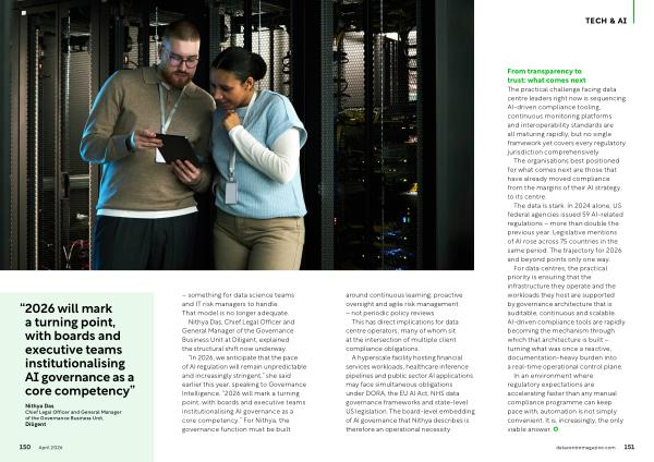 A hyperscale facility hosting financial services workloads, healthcare inference pipelines and public sector AI applications may face simultaneous obligations under DORA, the EU AI Act, NHS data governance frameworks and state-level US legislation. The board-level embedding of AI governance that Nithya describes is therefore an operational necessity.