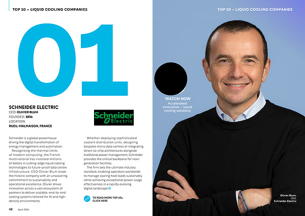 Schneider is a global powerhouse driving the digital transformation of energy management and automation. Recognising the thermal limits of modern computing, the French multinational has invested millions of dollars in cutting-edge liquid cooling technologies to future-proof data centre infrastructure. CEO Olivier Blum leads the historic company with an unwavering commitment to sustainability and operational excellence. Olivier drives innovation across a vast ecosystem of partners to deliver scalable, end-to-end cooling systems tailored for AI and highdensity environments.
