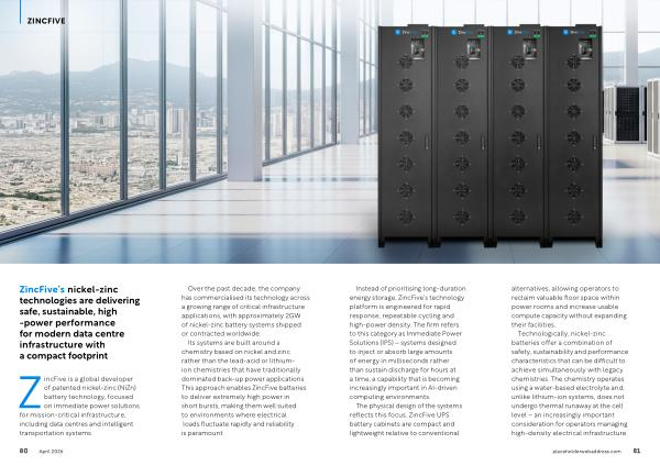 Its systems are built around a chemistry based on nickel and zinc rather than the lead-acid or lithiumion chemistries that have traditionally dominated back-up power applications. This approach enables ZincFive batteries to deliver extremely high power in short bursts, making them well suited to environments where electrical loads fluctuate rapidly and reliability is paramount.