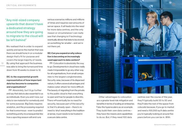 PP : Absolutely , but I ’ d go further and say that data is also essential to us as individuals . Even you and I now , our data is raw material for somebody and for some purpose . Big Data requires analytics , and the processing required for that is enormous – even to predict something pretty inconsequential like how a sporting season will end runs various scenarios millions and millions of times and requires vast amounts of server space . It all feeds into the need for more data centres , and the only reason or circumstance I can really see that changing is if technology eventually allows that data to be stored on something far smaller – and we ’ re not there yet .