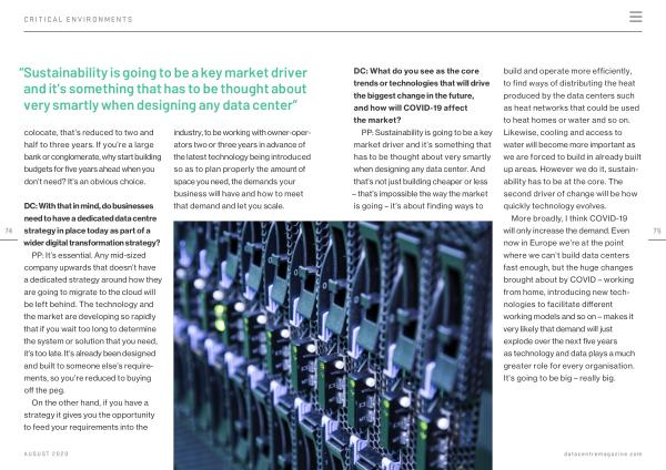 DC : With that in mind , do businesses need to have a dedicated data centre strategy in place today as part of a wider digital transformation strategy ? PP : It ’ s essential . Any mid-sized company upwards that doesn ’ t have a dedicated strategy around how they are going to migrate to the cloud will be left behind . The technology and the market are developing so rapidly that if you wait too long to determine the system or solution that you need , it ’ s too late . It ’ s already been designed and built to someone else ’ s requirements , so you ’ re reduced to buying off the peg .