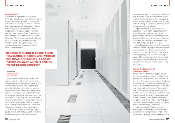 Pushing the Boundaries of Power and Cooling A huge part of what makes Edge Centres ’ sites function independently from both the grid and ( so far ) their own UPS generators is the innovative approach that Eaves has taken to powering and cooling his facilities . Again , Eaves reflects that the challenges of the past year were a pivotal source of innovation . “ We ' ve actually developed our own air conditioners which sit differently to the units you can buy off the shelf . The problem with the off the shelf units is that , because of the pandemic , the world has a shortage of containers , which makes trying to get things delivered a challenge ,” he recalls .