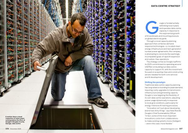 A worker does a visual inspection of water pipes running below the floor at Google’ s Douglas County, Georgia, data centre