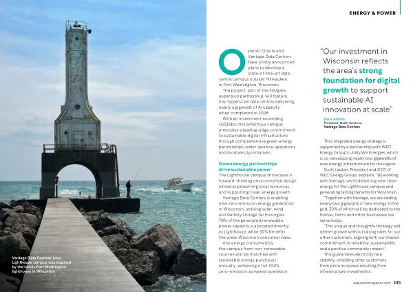 This integrated energy strategy is supported by a partnership with WEC Energy Group’ s utility We Energies, which is co-developing nearly two gigawatts of new energy infrastructure for the region. Scott Lauber, President and CEO of WEC Energy Group, explains:“ By working with Vantage, we’ re delivering new clean energy for the Lighthouse campus and generating lasting benefits for Wisconsin.