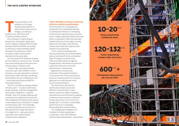The acceleration of AI adoption is forcing a fundamental rethink of data centre infrastructure design, according to Andrea Ferro, VP Power and IT Systems EMEA at Vertiv.
