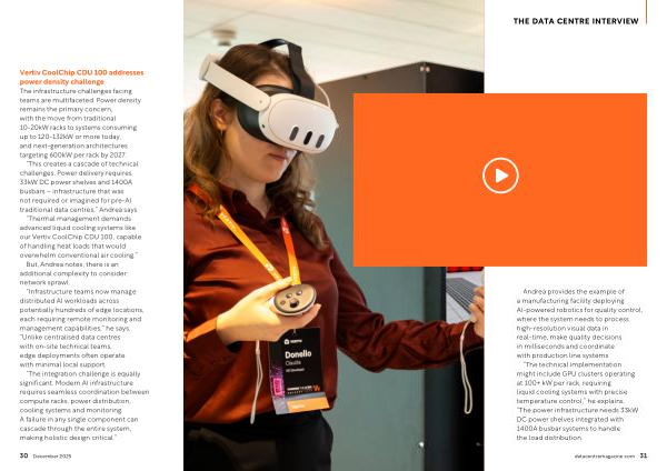 THE DATA CENTRE INTERVIEW Andrea provides the example of a manufacturing facility deploying AI-powered robotics for quality control, where the system needs to process high-resolution visual data in real-time, make quality decisions in milliseconds and coordinate with production line systems.