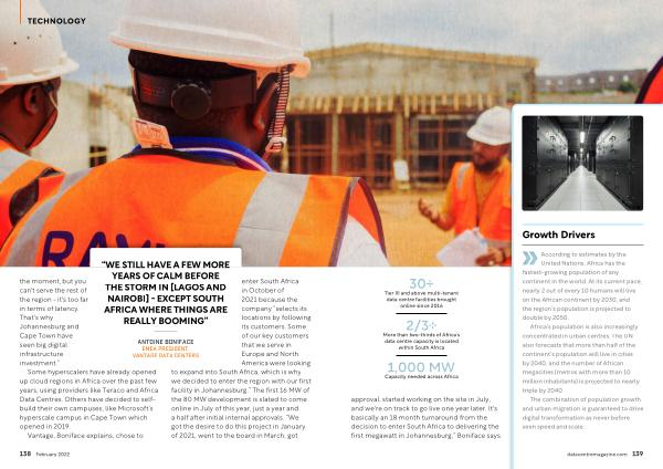 ANTOINE BONIFACE EMEA PRESIDENT , VANTAGE DATA CENTERS enter South Africa in October of 2021 because the company “ selects its locations by following its customers . Some of our key customers that we serve in Europe and North America were looking to expand into South Africa , which is why we decided to enter the region with our first facility in Johannesburg .” The first 16 MW of the 80 MW development is slated to come online in July of this year , just a year and a half after initial internal approvals . “ We got the desire to do this project in January of 2021 , went to the board in March , got