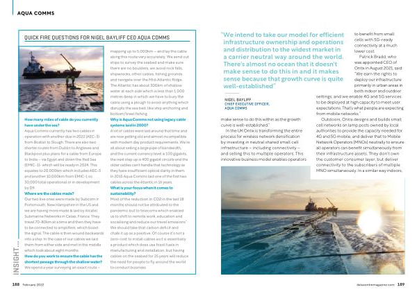 mapping up to 5,000km – and lay the cable along this route very accurately . We send out ships to survey the seabed and make sure there are no boulders , we avoid rock falls , shipwrecks , other cables , fishing grounds and navigate over the Mid-Atlantic Ridge . The Atlantic has about 300km of shallow water at each side which is less than 1,000 metres deep in which we have to bury the cable using a plough to avoid anything which disrupts the sea bed , like ship anchoring and bottom / trawl fishing . Why is Aqua Comms not using legacy cable systems laid in 2000 ? A lot of cables were laid around that time and are now getting old and almost incompatible with modern day product requirements . We ’ re all about selling a large pipe of bandwidth , and the current currency level is 100 gigabits , the next step up is 400 gigabit circuits and the older cables can ' t handle that technology as they have insufficient optical clarity in them . In 2015 Aqua Comms laid one of the first two cables across the Atlantic in 16 years . What is your focus when it comes to sustainability ? Most of the reduction in CO2 in the last 18 months should not be attributed to the pandemic but to telecoms which enabled us to shift to remote work , education and socialising and reduce our travel emissions ” We should take that carbon deficit and chalk it up as a positive . Of course it ’ s not a zero-cost to install cables as it is essentially a product which does use fossil fuels in manufacturing and installation , but having cables on the seabed for 25 years will reduce the need for people to fly around the world to conduct business .