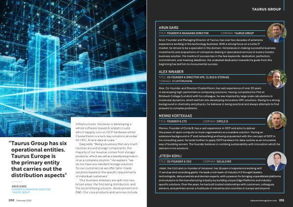ARUN GARG FOUNDER & MANAGING DIRECTOR , TAURUS GROUP infrastructures . Solulever is developing a whole software-based AI analytics suite which happily runs on OCP hardware whilst ClusterVision is a turn-key solutions provider for HPC , AI and data at scale . ”