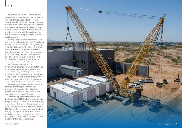 He pointed out why NTT ’ s build-to-suit approach is unique . “ I think our most unique qualities that set us apart are our team ’ s speed , flexibility and agility to react to client needs in the way that they are used to within their own organisations . This goes a long way with the stakeholders as that level of trust is needed especially with the significance of the builds we are being entrusted to deliver ,” said Stapleton .