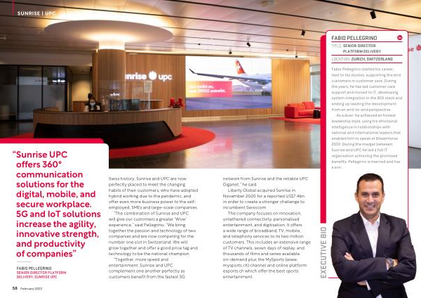 As a doer , he achieved an honest leadership style , using his emotional intelligence in relationships with national and international leaders that enabled him to speak at Dreamforce 2019 . During the merger between Sunrise and UPC he led a full IT organisation achieving the promised benefits . Pellegrino is married and has a son . network from Sunrise and the reliable UPC Giganet ,” he said .