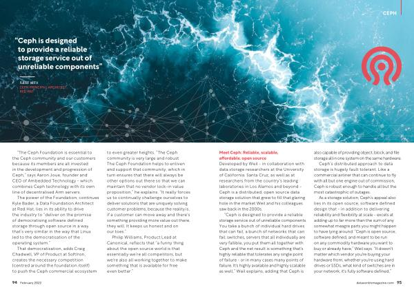 “ Ceph is designed to provide a reliable storage service out of unreliable components . You take a bunch of individual hard drives that can fail , a bunch of networks that can fail , switches , servers that all individually are very fallible , you put them all together with Ceph and the net result is something that ' s highly reliable that tolerates any single point of failure - or in many cases many points of failure . It ' s highly available and highly scalable as well ,” Weil explains , adding that Ceph is also capable of providing object , block , and file storage all in one system on the same hardware .