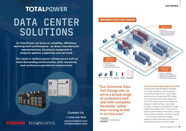 Universal data hall design innovation Several years ago DataBank changed its design standards, developing an innovative design that it calls a highperformance computing( HPC) ready‘ Universal Data Hall Design’ approach. This shift moved away from traditional design to slab flooring to perimeter cooling – an approach perfect for large hyperscale deployment. The purposebuilt solutions deliver the power, cooling and scalability needed in today’ s market.