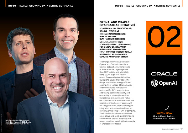 The Stargate AI Initiative between OpenAI and Oracle is one of the boldest bets yet on national‐scale AI infrastructure, targeting more than 5GW initially and ultimately up to 10GW as phases roll out across Texas and potentially other US regions. Beyond raw scale, the design emphasises energy‐efficient cooling, high‐voltage DC distribution and modular pod architectures optimised for GPU superclusters, addressing both sustainability and operability at ultra‐high densities. Stargate is a glimpse into AI‐native data centre futures where facilities are treated as critical energy assets, with on‐site generation, sophisticated grid integration and a relentless focus on reducing emissions per unit of compute. The initiative also demonstrates how cross‐cloud and multi‐partner models can combine capital, expertise and power to deliver sustainable AI capacity at unprecedented scale.