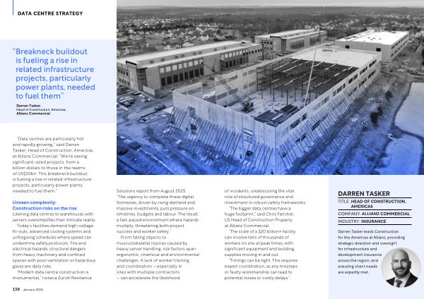 “ Data centres are particularly hot and rapidly growing,” said Darren Tasker, Head of Construction, Americas, at Allianz Commercial.“ We’ re seeing significant-sized projects, from a billion dollars to those in the realms of US $ 20bn. This breakneck buildout is fueling a rise in related infrastructure projects, particularly power plants, needed to fuel them.”