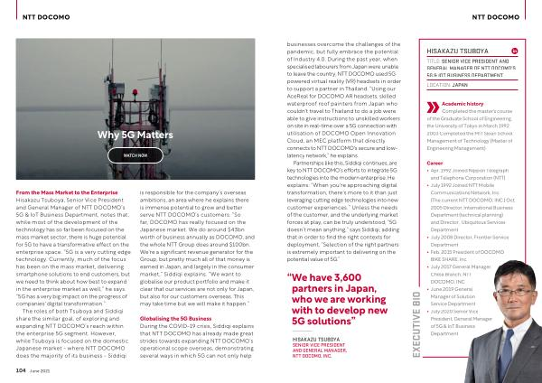 From the Mass Market to the Enterprise Hisakazu Tsuboya , Senior Vice President and General Manager of NTT DOCOMO ’ s 5G & IoT Business Department , notes that , while most of the development of the technology has so far been focused on the mass market sector , there is huge potential for 5G to have a transformative effect on the enterprise space . “ 5G is a very cutting edge technology . Currently , much of the focus has been on the mass market , delivering smartphone solutions to end customers , but we need to think about how best to expand in the enterprise market as well ,” he says . “ 5G has a very big impact on the progress of companies ' digital transformation .”