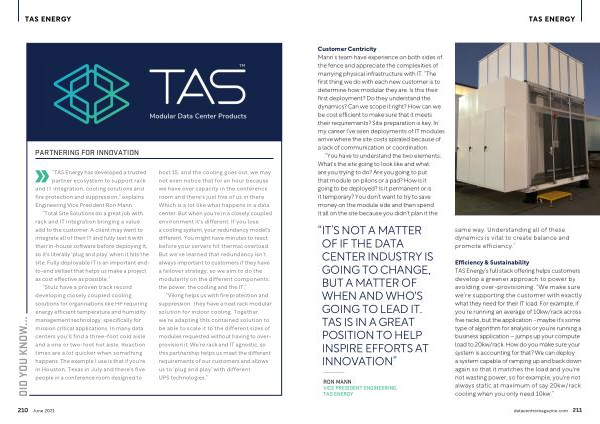 “ TAS Energy has developed a trusted partner ecosystem to support rack and IT integration , cooling solutions and fire protection and suppression ,” explains Engineering Vice President Ron Mann .