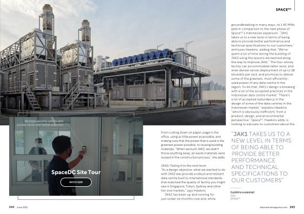 groundbreaking in many ways , its 1.45 MWs pale in comparison to the next phase of Space DC ’ s Indonesian expansion . “ JAK1 takes us to a new level in terms of being able to provide better performance and technical specifications to our customers ,” enthuses Hawkins , adding that , “ We ' ve spent a lot of time during the building of JAK2 using the lessons we learned along the way to improve JAK1 .” The four-storey facility can accommodate taller racks , and even denser server deployment of up to 10 kilowatts per rack , and promises to deliver some of the greenest , most efficientlyused power of any data centre in the region . To do that , JAK1 ’ s design is breaking with a lot of the accepted practices in the Indonesian data centre market . “ There ' s a lot of accepted redundancy in the design of some of the data centres in the Indonesian market ,” explains Hawkins , “ which is obviously inefficient , from a product , design , and environmental perspective .” Space DC , Hawkins adds , is looking to educate its customers about the