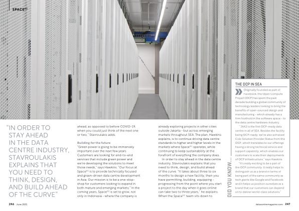 “ JAK2 is the first OCP-ready data centre in all of SEA . Besides the facility being OCP-ready , we ' ve also achieved Colo Solution Provider Status from the OCP , which translates to our offerings having a strong technical service and support capability , which enables our customers to scale their deployments of OCP infrastructure ,” says Hawkins . “ It ' s really exciting to be a part of the OCP community . It really helps to distinguish us as a brand in terms of being part of the same community as tech giants like Google and Facebook , and it helps us position ourselves as a brand that our customers can depend on to deliver world-class solutions .”