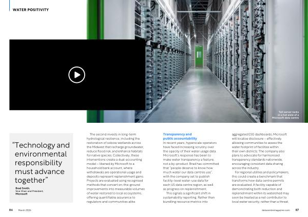 The second invests in long-term hydrological resilience, including the restoration of oxbow wetlands across the Midwest that recharge groundwater, reduce flood risk, and enhance habitats for native species. Collectively, these interventions create a dual-accounting model – likened by Microsoft to a household bank account, where withdrawals are operational usage and deposits represent replenishment gains. Projects are evaluated using recognised methods that convert on-the-ground improvements into measurable volumes of water restored to local ecosystems, offering quantifiable assurance to regulators and communities alike.