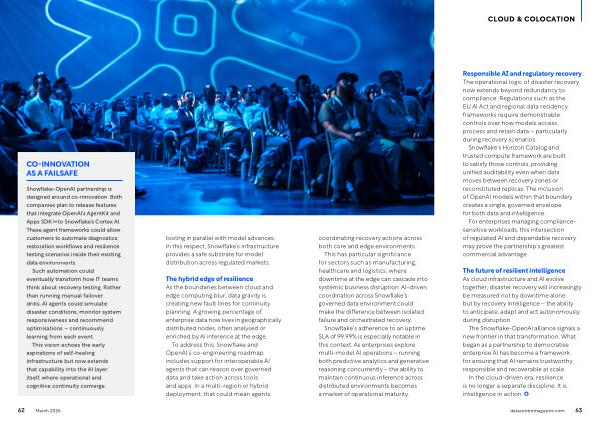 The hybrid edge of resilience As the boundaries between cloud and edge computing blur, data gravity is creating new fault lines for continuity planning. A growing percentage of enterprise data now lives in geographically distributed nodes, often analysed or enriched by AI inference at the edge. To address this, Snowflake and OpenAI’ s co-engineering roadmap includes support for interoperable AI agents that can reason over governed data and take action across tools and apps. In a multi-region or hybrid deployment, that could mean agents