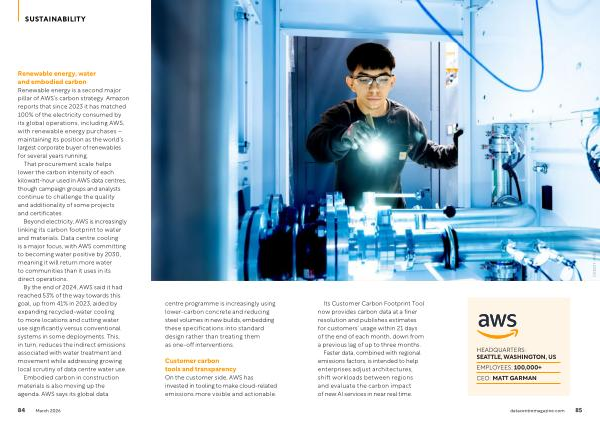 Beyond electricity, AWS is increasingly linking its carbon footprint to water and materials. Data centre cooling is a major focus, with AWS committing to becoming water positive by 2030, meaning it will return more water to communities than it uses in its direct operations.