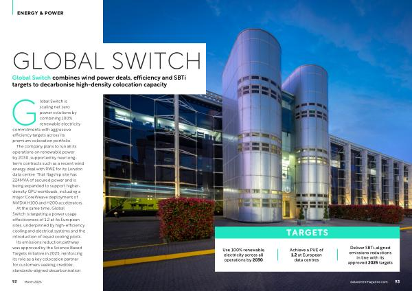At the same time, Global Switch is targeting a power usage effectiveness of 1.2 at its European sites, underpinned by high-efficiency cooling and electrical systems and the introduction of liquid cooling pilots.