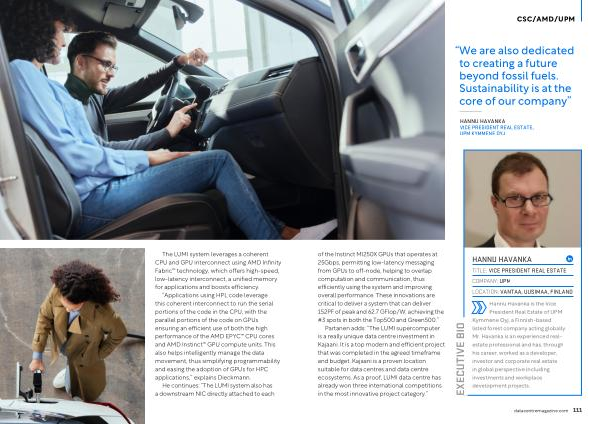 HANNU HAVANKA VICE PRESIDENT REAL ESTATE , UPM KYMMENE OYJ of the Instinct MI250X GPUs that operates at 25Gbps , permitting low-latency messaging from GPUs to off-node , helping to overlap computation and communication , thus efficiently using the system and improving overall performance . These innovations are critical to deliver a system that can deliver 152PF of peak and 62.7 GFlop / W , achieving the # 3 spots in both the Top500 and Green500 .”
