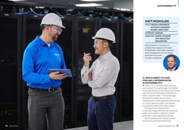 »“ Direct‐to‐chip( D2C) liquid cooling uses coolant flowing through cold plates mounted directly on processors to remove heat 100 times more efficiently than air alone,” explains Matt.“ This technology also permits higher return water temperatures, enabling partial free cooling on cooler days and nights, decreasing the need for additional chiller energy.