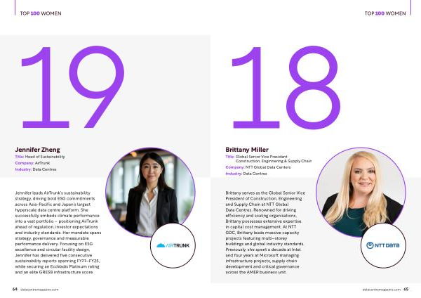 Brittany serves as the Global Senior Vice President of Construction, Engineering and Supply Chain at NTT Global Data Centres. Renowned for driving efficiency and scaling organisations, Brittany possesses extensive expertise in capital cost management. At NTT GDC, Brittany leads massive capacity projects featuring multi – storey buildings and global industry standards. Previously, she spent a decade at Intel and four years at Microsoft managing infrastructure projects, supply chain development and critical governance across the AMER business unit. datacentremagazine. com 65