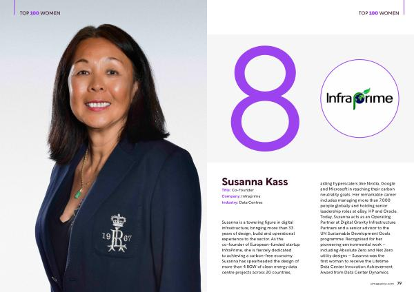 Susanna is a towering figure in digital infrastructure, bringing more than 33 years of design, build and operational experience to the sector. As the co-founder of European-funded startup InfraPrime, she is fiercely dedicated to achieving a carbon-free economy. Susanna has spearheaded the design of more than 4.8GW of clean energy data centre projects across 20 countries, aiding hyperscalers like Nvidia, Google and Microsoft in reaching their carbon neutrality goals. Her remarkable career includes managing more than 7,000 people globally and holding senior leadership roles at eBay, HP and Oracle. Today, Susanna acts as an Operating Partner at Digital Gravity Infrastructure Partners and a senior advisor to the UN Sustainable Development Goals programme. Recognised for her pioneering environmental work – including Absolute Zero and Net Zero utility designs – Susanna was the first woman to receive the Lifetime Data Center Innovation Achievement Award from Data Center Dynamics.