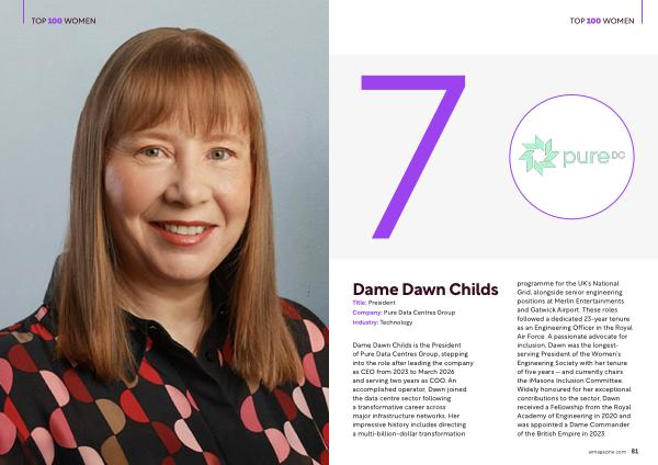 Dame Dawn Childs is the President of Pure Data Centres Group, stepping into the role after leading the company as CEO from 2023 to March 2026 and serving two years as COO. An accomplished operator, Dawn joined the data centre sector following a transformative career across major infrastructure networks. Her impressive history includes directing a multi-billion-dollar transformation programme for the UK’ s National Grid, alongside senior engineering positions at Merlin Entertainments and Gatwick Airport. These roles followed a dedicated 23-year tenure as an Engineering Officer in the Royal Air Force. A passionate advocate for inclusion, Dawn was the longestserving President of the Women’ s Engineering Society with her tenure of five years – and currently chairs the iMasons Inclusion Committee. Widely honoured for her exceptional contributions to the sector, Dawn received a Fellowship from the Royal Academy of Engineering in 2020 and was appointed a Dame Commander of the British Empire in 2023.