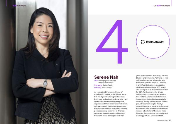 As Managing Director and Head of Asia Pacific, Serene is the driving force behind Digital Realty’ s growth across both new and established markets. Her leadership also ensures the regional expansion of the firm’ s PlatformDIGITAL software, which facilitates interactions between tech sector specialists. Serene possesses deep expertise in finance, corporate development and business transformation, developed over her years spent at firms including General Electric and Silverlake Partners, as well as Kerry Properties, where she was Executive Director and CFO. Serene is an influential voice in the sector, chairing the Digital Core REIT board and acting as an independent director for ESR. Furthermore, she drives unified policy conversations as Vice Chair of the Asia Pacific Data Centre Association. A steadfast advocate for diversity, equity and inclusion, Serene proudly sponsors Digital Realty’ s regional Women’ s Leadership Forum in Asia Pacific. Her academic credentials include a Bachelor of Business from Nanyang Technological University and a Kellogg-HKUST Executive MBA.